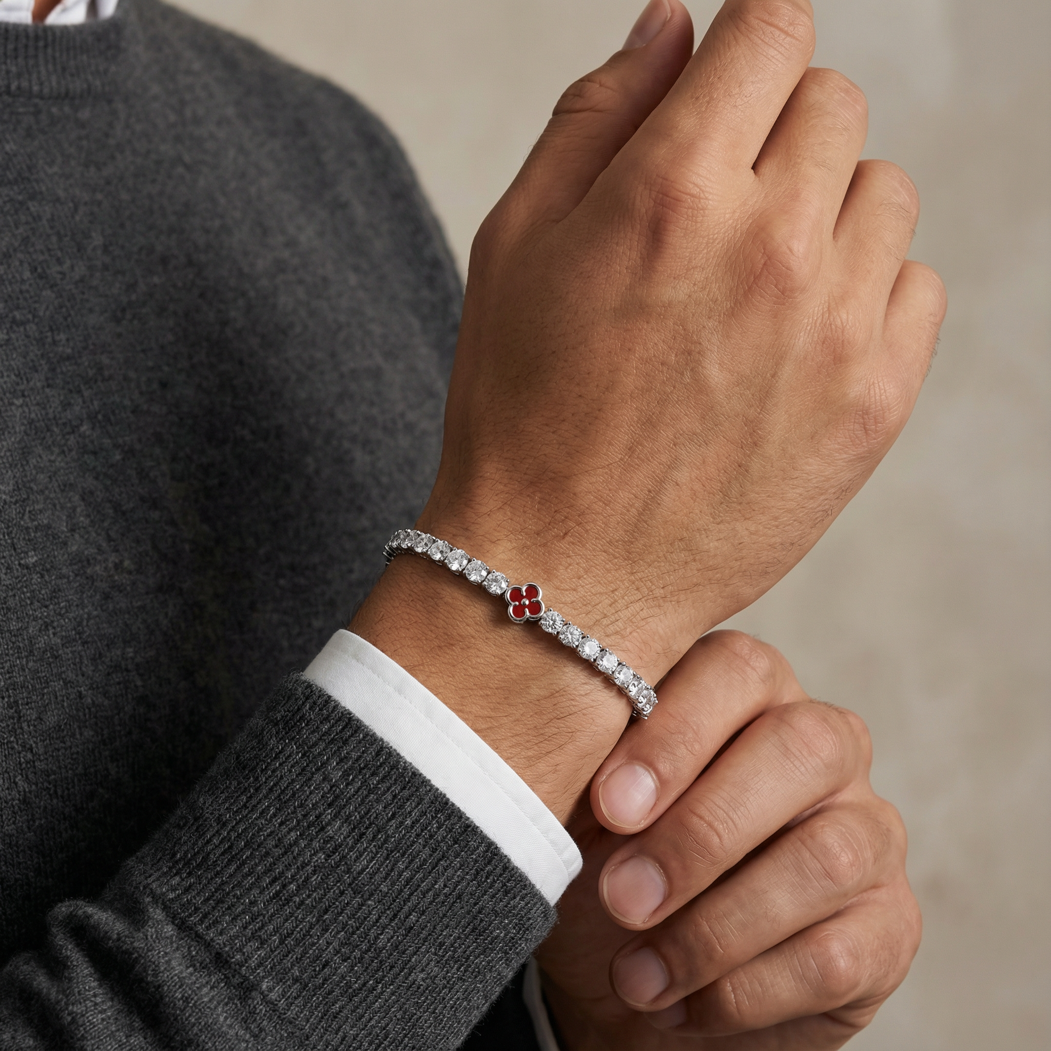 A row of bright stones finished with a red clover charm – a symbol of luck and love.