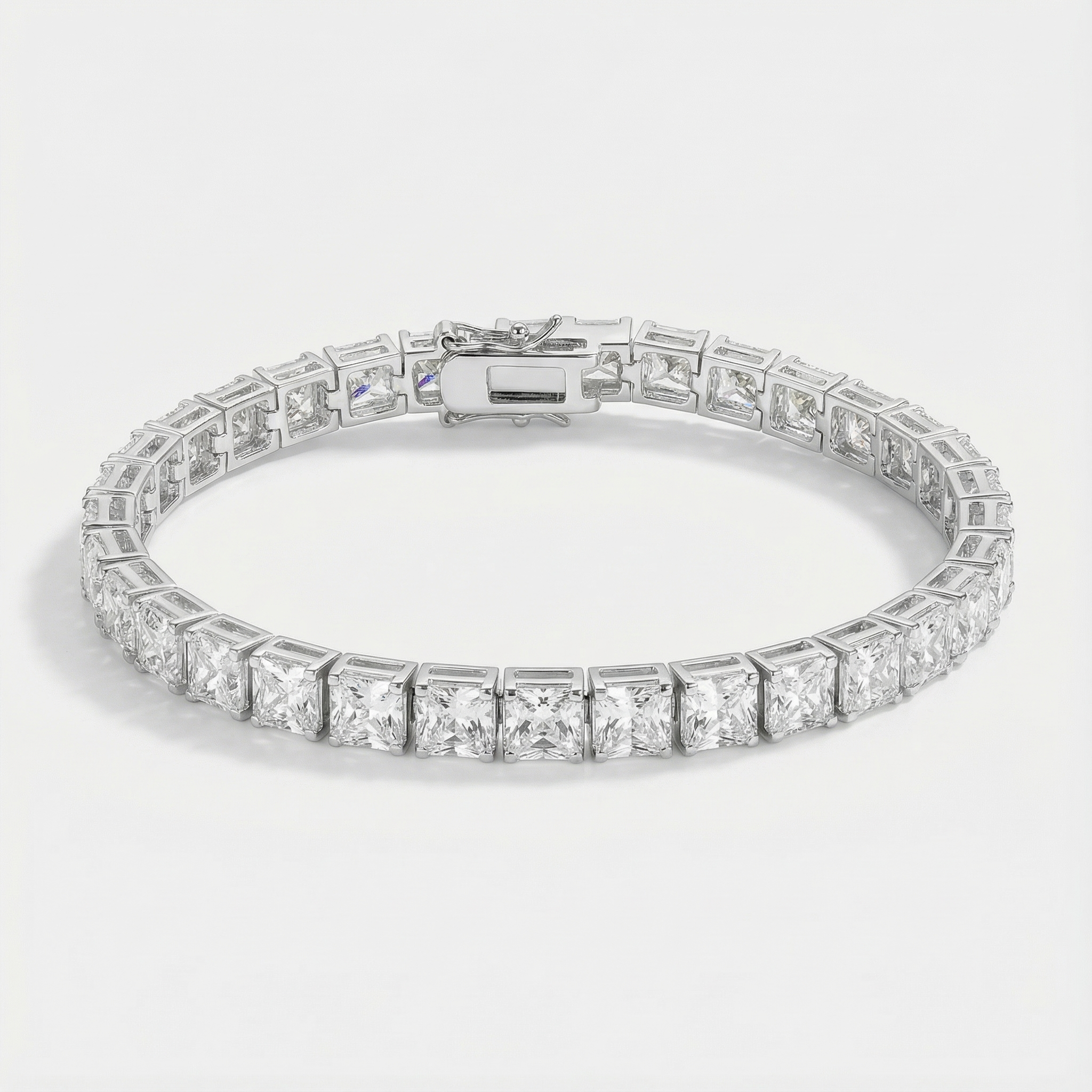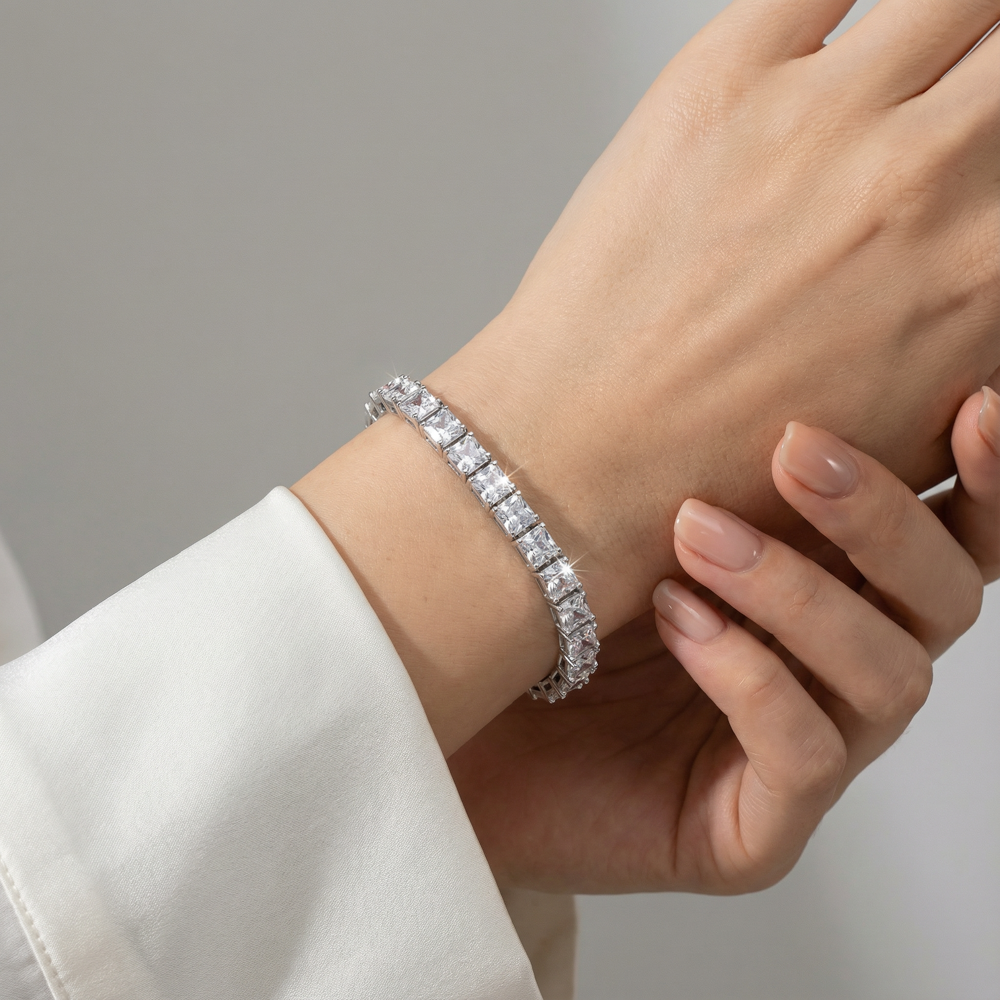 A clean, full-ice tennis bracelet with perfectly aligned square-cut stones that hit from every angle, made to look like real diamonds and upgrade any wrist in seconds.