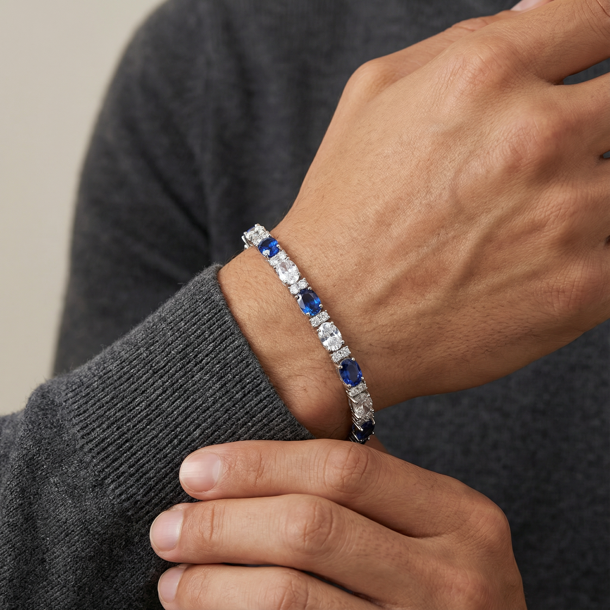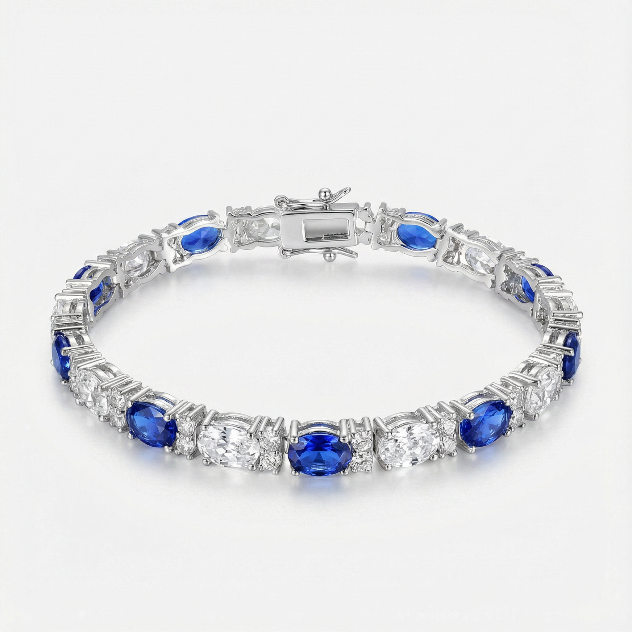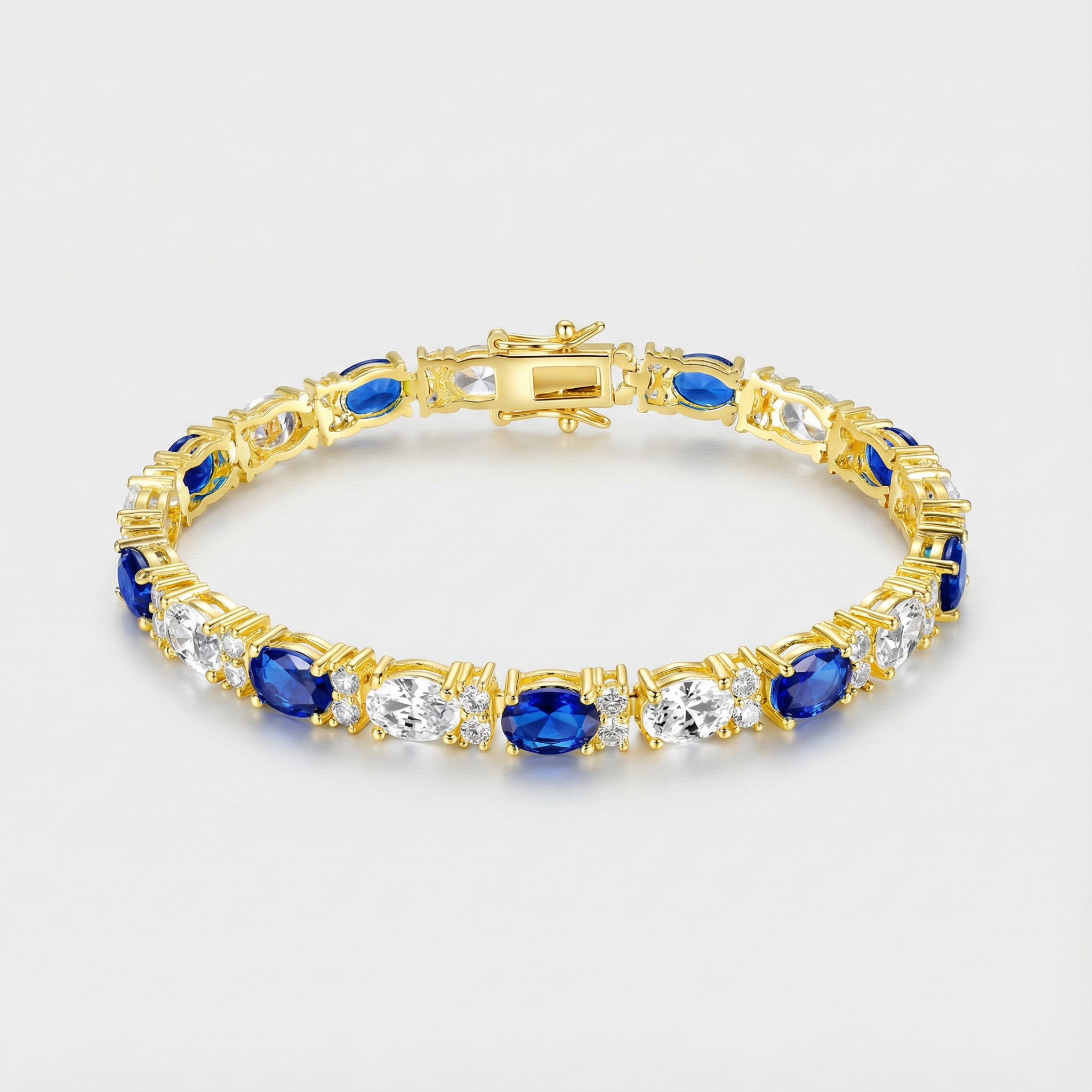 A royal-style tennis bracelet with deep sapphire-blue stones framed by bright clear gems, made to look like something straight out of a luxury showcase.