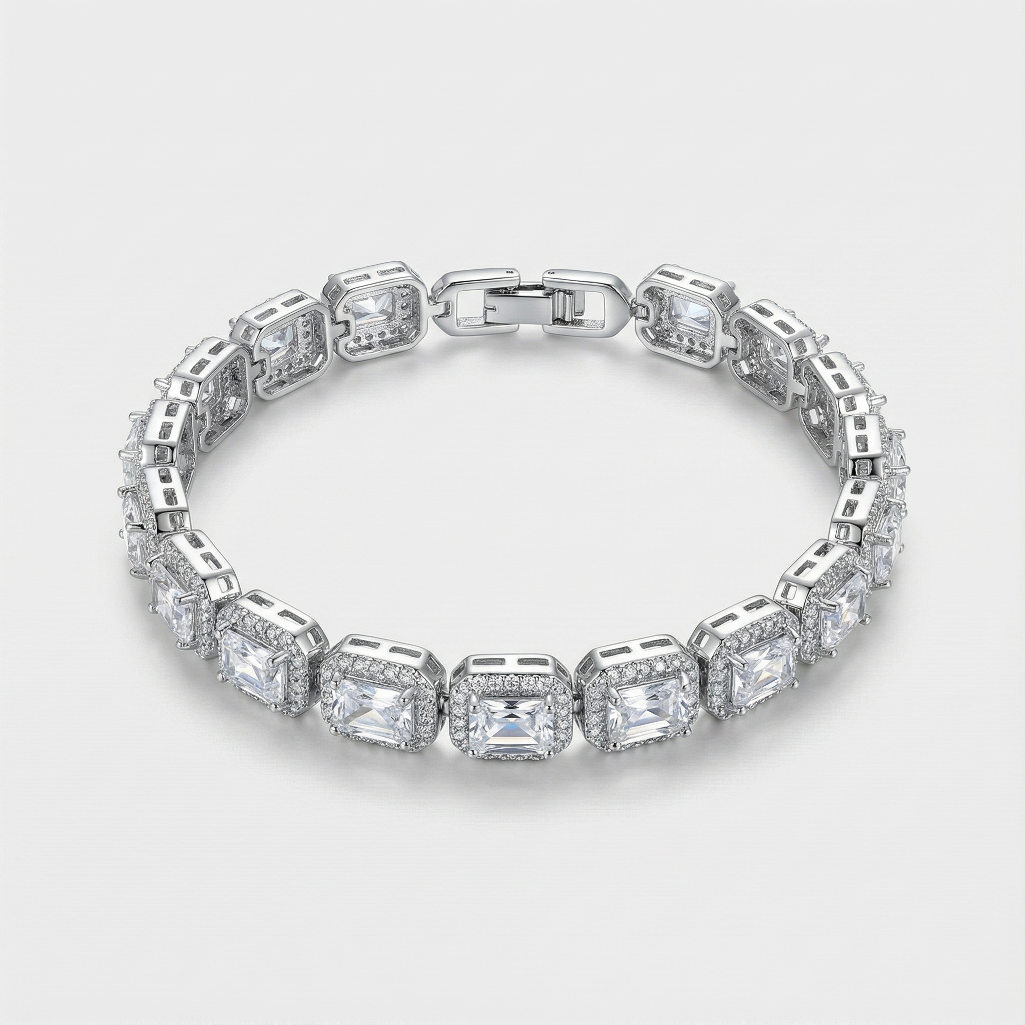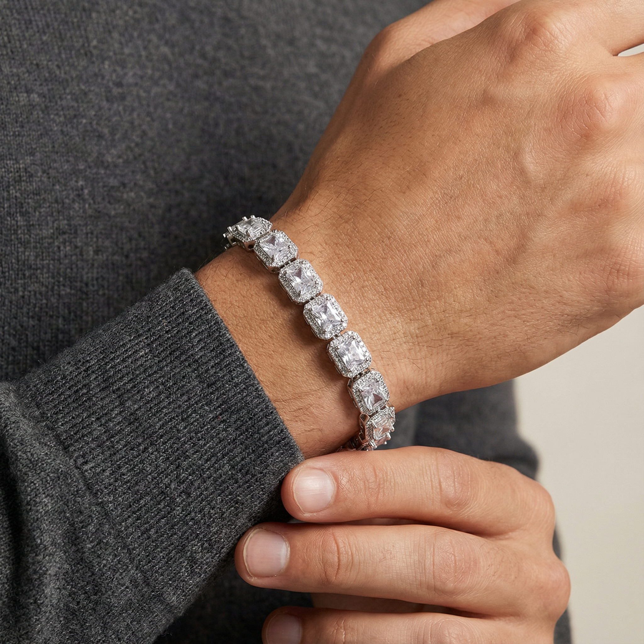 A bold, icy bracelet with oversized square halo-set stones that look like they were lifted straight from a high-end watch bezel and wrapped around your wrist.
