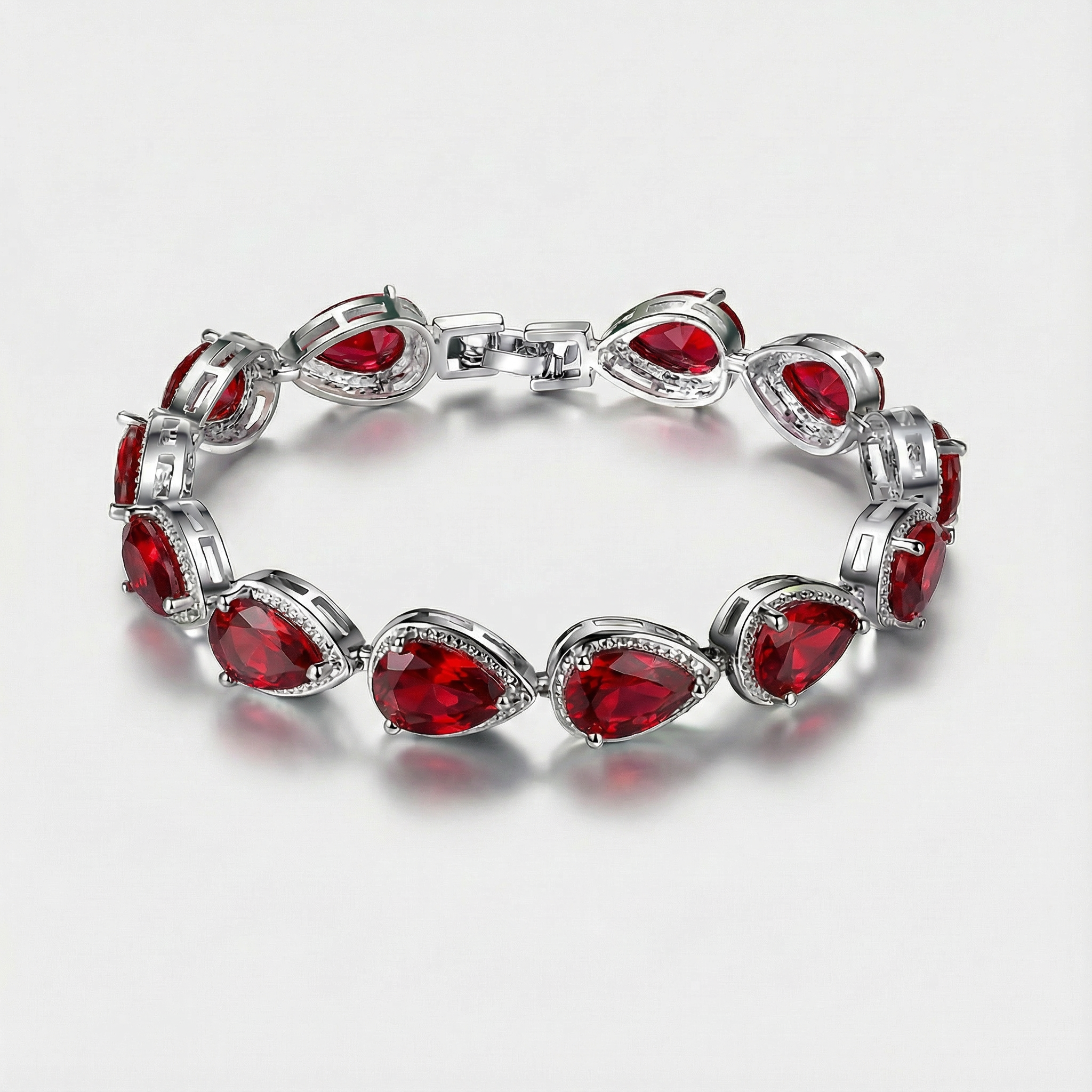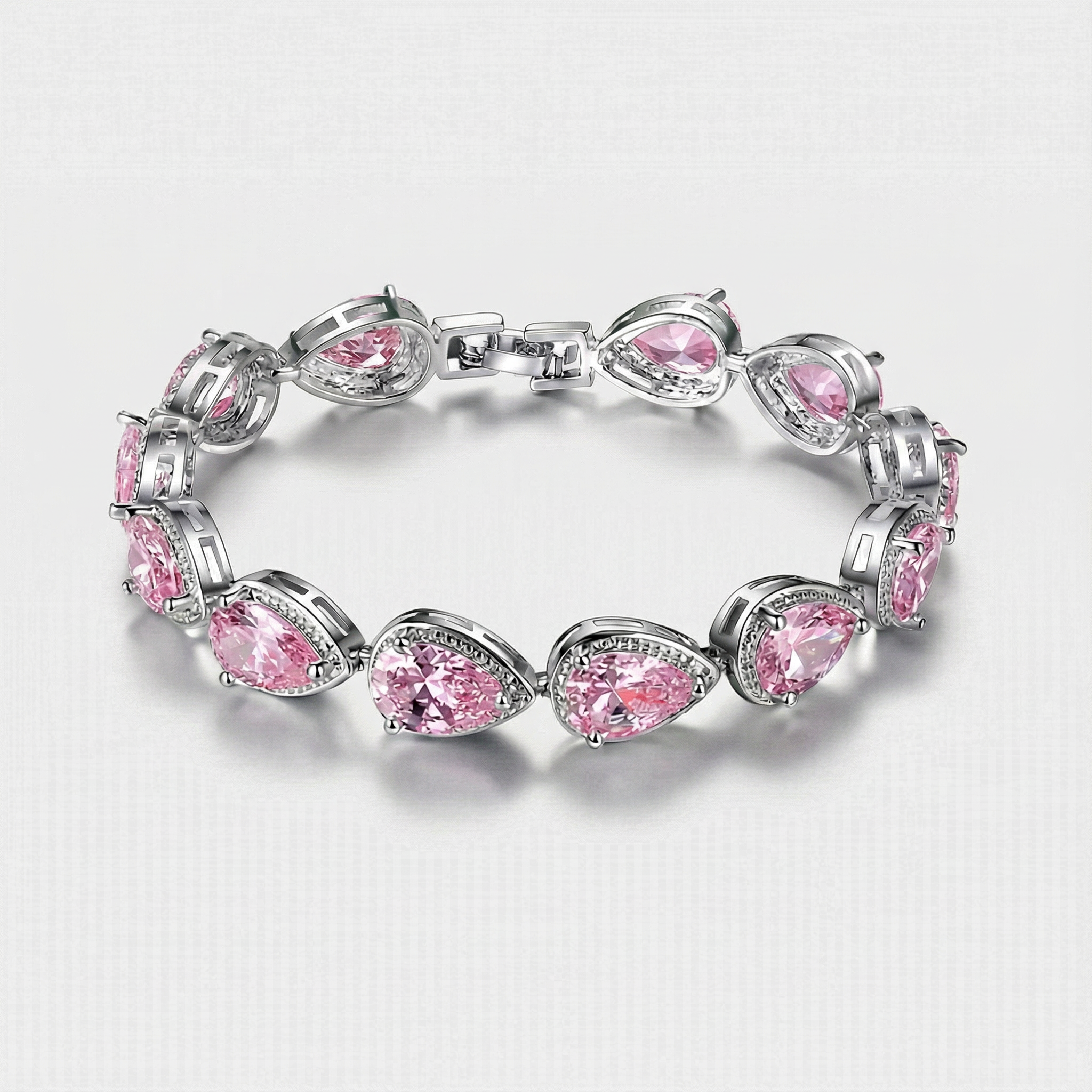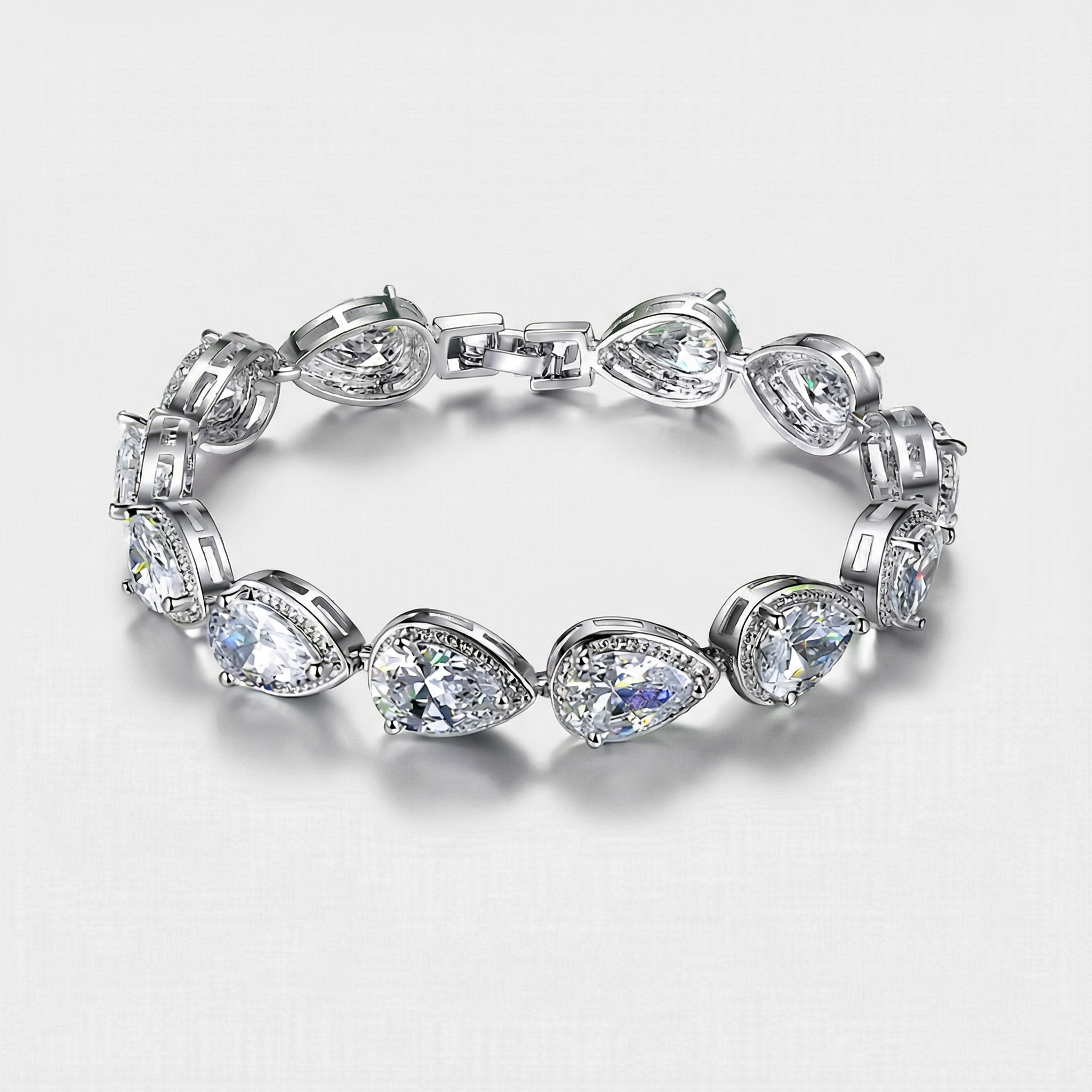 A glowing tennis bracelet with pear-cut “teardrop” stones set in sleek silver links, made to catch the light with every move.